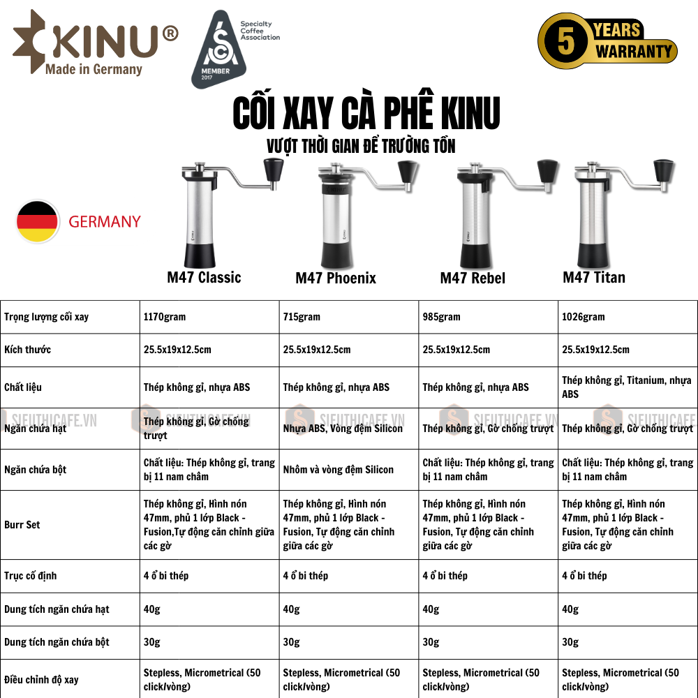 Cối xay cà phê bằng tay Kinu M47 PhoenixThông số chi tiết của cối xay tay Kinu M47 Phoenix: