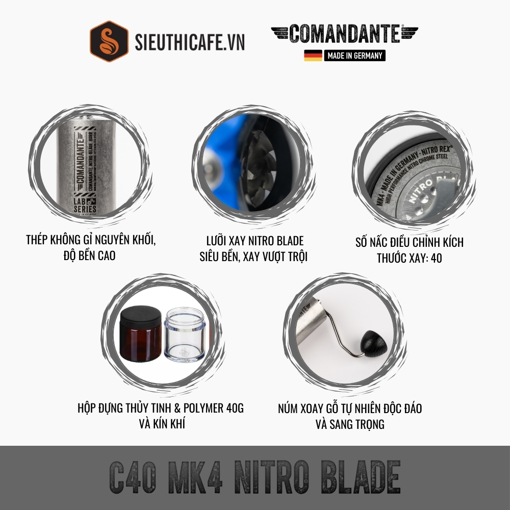 - Chiếc cối này được chế tạo từ thép không gỉ NITRO REX® cao cấp, nổi bật với độ bền và khả năng chống ăn mòn xuất sắc. Comandante C40 Nitro Blade cung cấp khả năng xay hạt cà phê chính xác và đồng nhất giúp cho người sử dụng có trải nghiệm pha chế vượt trội.