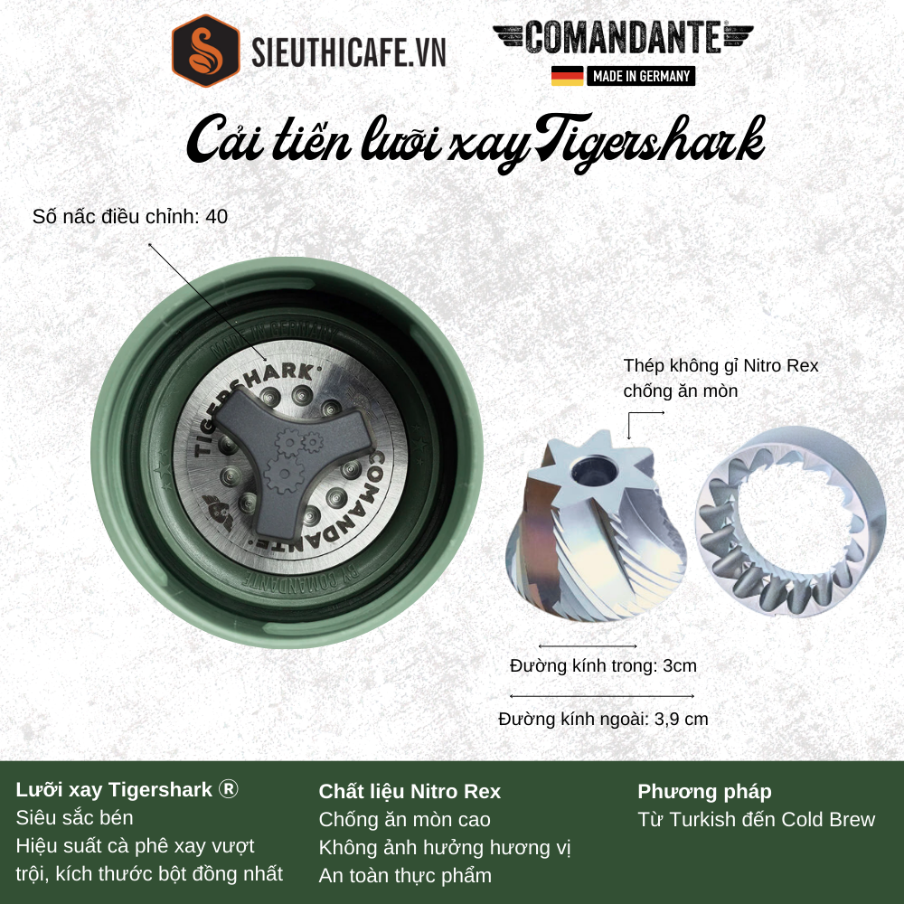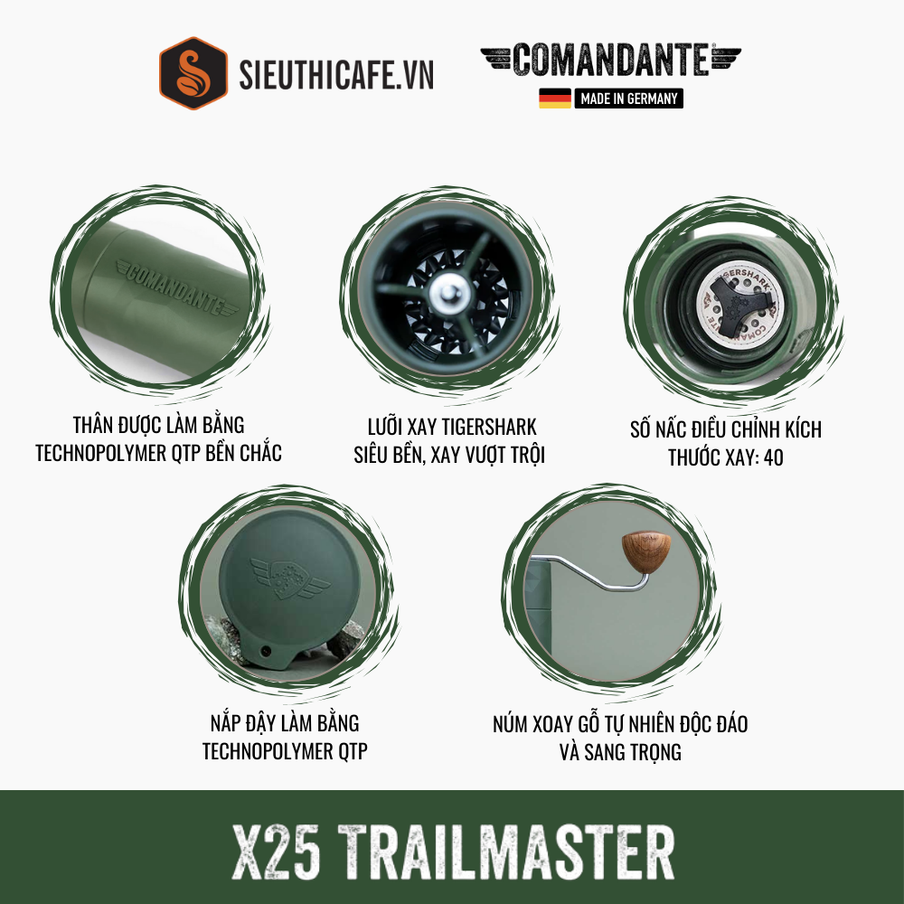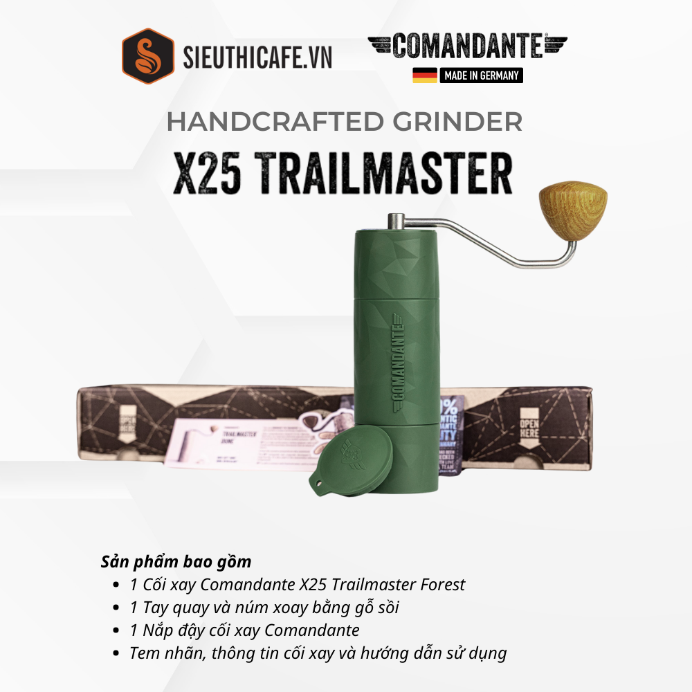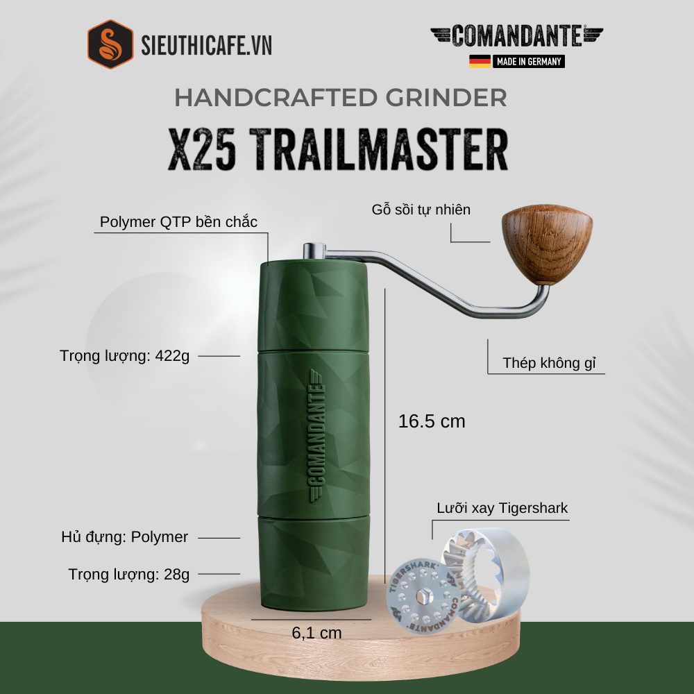 Cối xay cầm tay X25 Trailmaster của Comandante là chiếc cối xay cà phê hoàn hảo cho những ai thích xê dịch. Chiếc cối được thiết kế để chịu được các điều kiện khắc nghiệt và được làm từ technopolyme gia cố, loại vật liệu này thường được sử dụng để sản xuất các bộ phận trên xe ô tô như hộp số.Cối xay Comandante X25 Trailmaster có thiết kế đa giác độc đáo phản chiếu ánh sáng và tạo cảm giác cho người nhìn về các sắc thái khác nhau ở một số góc nhìn nhất định. Thiết kế lưỡi xay Tigershark độc đáo được chế tạo từ thép không gỉ NITRO REX® cao cấp, nổi bật với độ bền và khả năng chống ăn mòn xuất sắc, cho phép xay hạt cà phê với hiệu suất cao hơn.