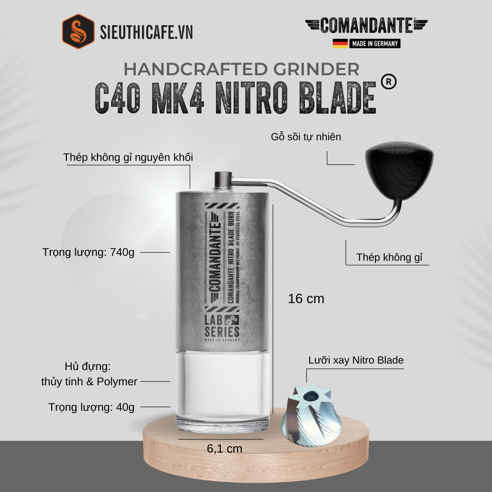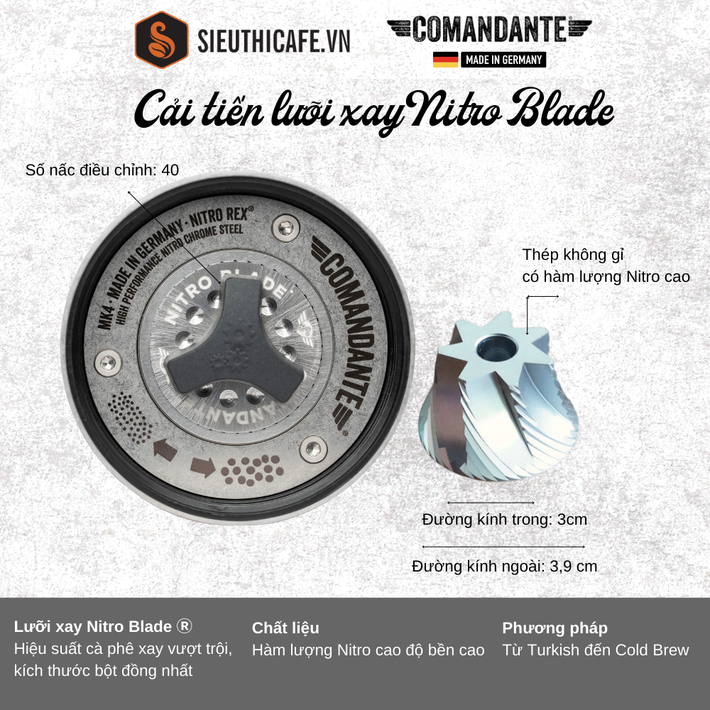 - Chiếc cối này được chế tạo từ thép không gỉ NITRO REX® cao cấp, nổi bật với độ bền và khả năng chống ăn mòn xuất sắc. Comandante C40 Nitro Blade cung cấp khả năng xay hạt cà phê chính xác và đồng nhất giúp cho người sử dụng có trải nghiệm pha chế vượt trội.