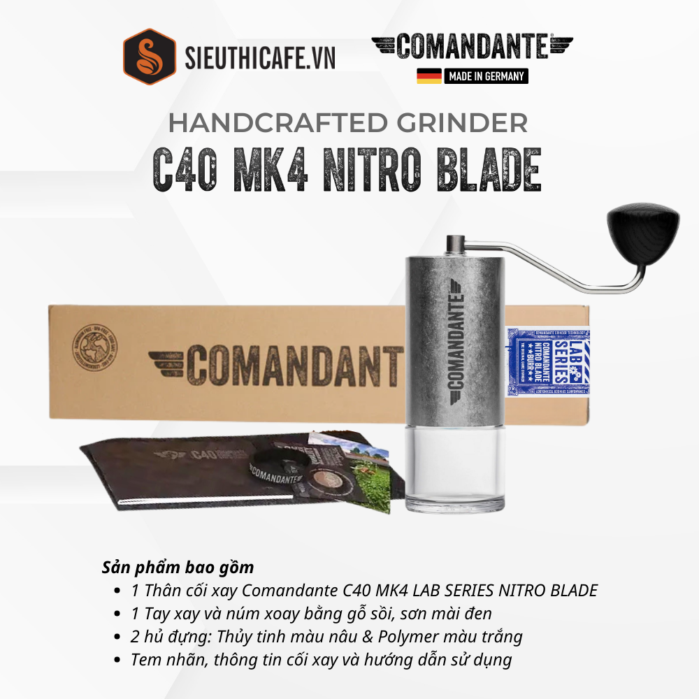 - Cối xay Comandante C40 MK4 LAB Series Nitro Blade là cối xay thủ công, không cần điện, rất lý tưởng cho việc sử dụng trong các chuyến đi du lịch hoặc cắm trại.