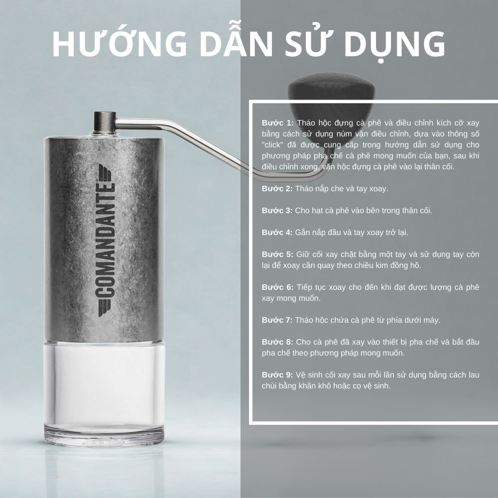 Bước 1: Tháo hộc đựng cà phê và điều chỉnh kích cỡ xay bằng cách sử dụng núm vặn điều chỉnh, dựa vào thông số "click" đã được cung cấp trong hướng dẫn sử dụng cho phương pháp pha chế cà phê mong muốn của bạn, sau khi điều chỉnh xong, vặn hộc đựng cà phê vào lại thân cối. Bước 2: Tháo nắp che và tay xoay. Bước 3: Cho hạt cà phê vào bên trong thân cối. Bước 4: Gắn nắp đầu và tay xoay trở lại. Bước 5: Giữ cối xay chặt bằng một tay và sử dụng tay còn lại để xoay cần quay theo chiều kim đồng hồ. Bước 6: Tiếp tục xoay cho đến khi đạt được lượng cà phê xay mong muốn. Bước 7: Tháo hộc chứa cà phê từ phía dưới máy. Bước 8: Cho cà phê đã xay vào thiết bị pha chế và bắt đầu pha chế theo phương pháp mong muốn. Bước 9: Vệ sinh cối xay sau mỗi lần sử dụng bằng cách lau chùi bằng khăn khô hoặc cọ vệ sinh.Ghi chú: