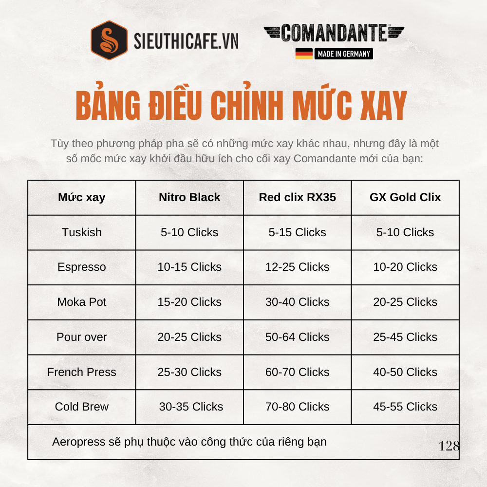 Tùy theo phương pháp pha sẽ có những mức xay khác nhau, nhưng đây là một số mốc mức xay khởi đầu hữu ích cho cối xay Comandante mới của bạn:- 5–10 Clicks cho phương pháp Turkish.