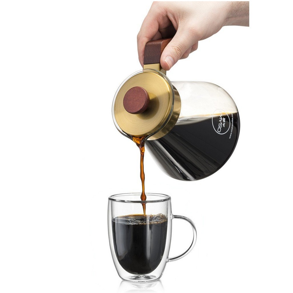 - FULL BREWING SET – Gold titanium coated stainless steel filter, waterproofed wood and metal stand, glass carafe with lid. Everything you need for a manually home brewed pour over coffee.