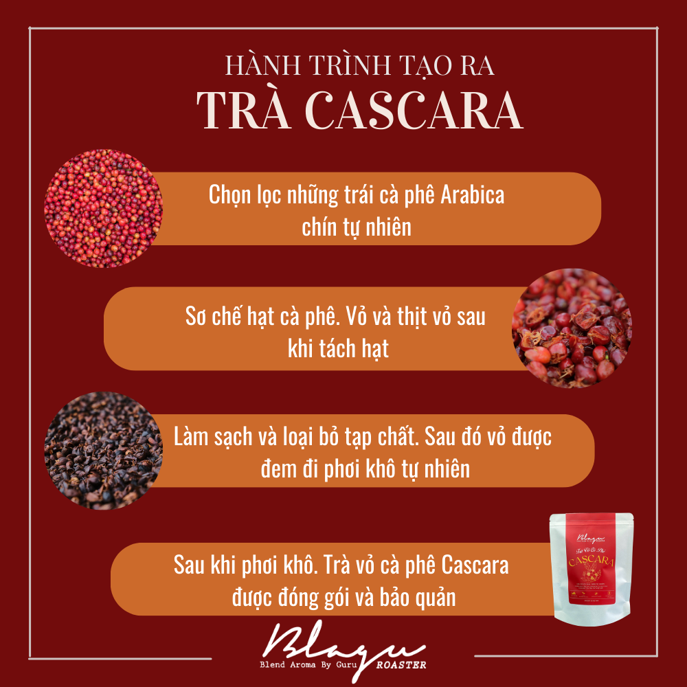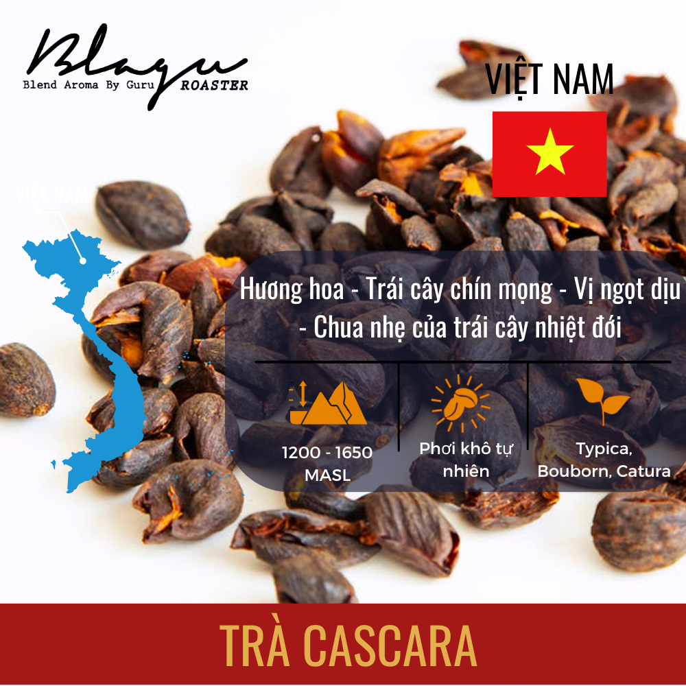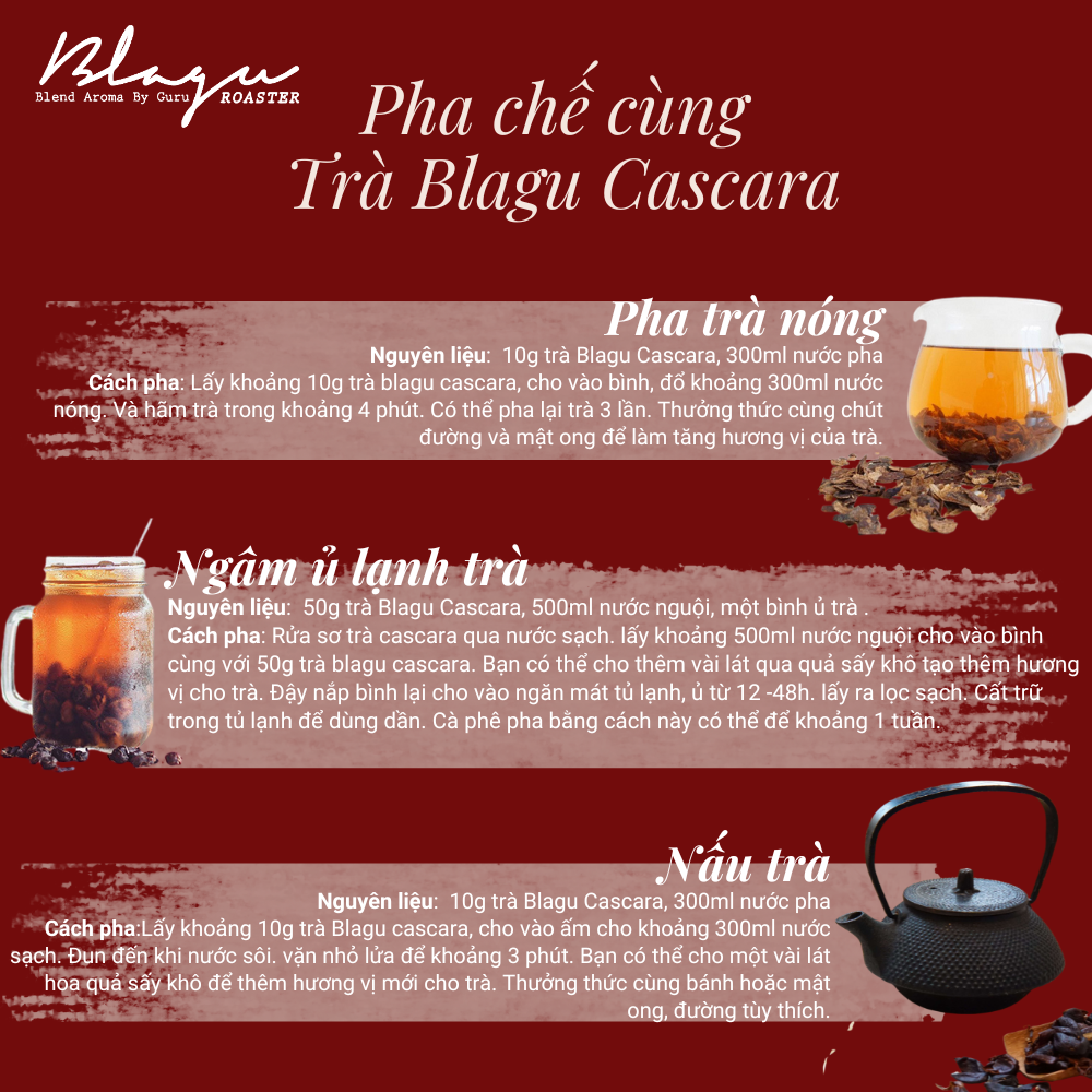 Trà vỏ cà phê Blagu Cascara được lấy từ những trái cà phê arabica được trồng ở độ cao 1200 - 1650 msl, sau khi chín được thu hái trải qua quá trình sơ chế để tách hạt cà phê, thì lớp vỏ bên ngoài cũng được mang đi chế biến theo phương pháp phơi khô tự nhiên. Khi thưởng thức trà Cascara vị chua nhẹ giống như quả anh đào, vừa có mùi thơm của hoa, vị ngọt dịu như mật ong. Bạn có thể pha rất nhiều cách với trà Cascara để thưởng thức hương vị của nó.